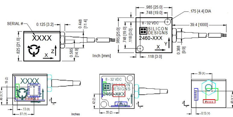 傳感器外殼表面清晰標注各軸向標識,定義正加速度方向為箭頭指示方位。模塊化封裝結構提供多樣化安裝方案,可通過配套螺釘、工業粘接劑或磁性基座實現快速固定。該系列產品憑借緊湊型結構與靈活部署特性,可適配復雜工業場景中的空間限制要求。