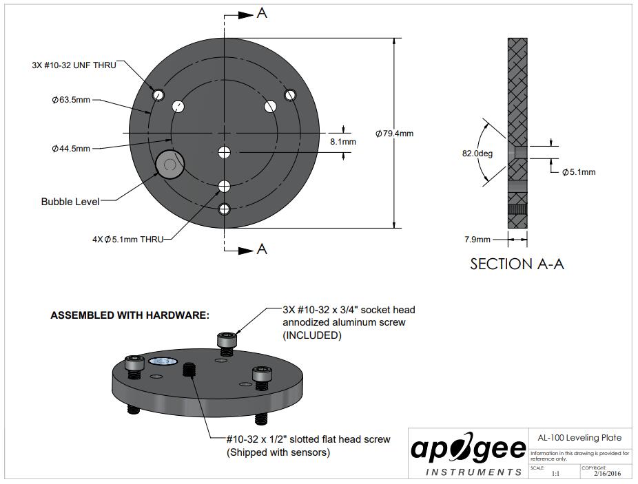 AL-100 水平板設(shè)計用于平面或安裝到表面,例如木材。水平板可以容納所有 Apogee 儀器的太陽輻射傳感器,例如總輻射表、量子傳感器等。正確的傳感器安裝要求傳感器在大多數(shù)應(yīng)用中盡可能水平。調(diào)平板包含一個集成的氣泡水平儀,設(shè)計用于在 -29 到 55 ℃ 之間工作,使調(diào)平變得簡單而準(zhǔn)確。