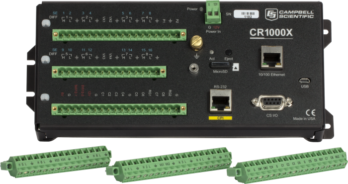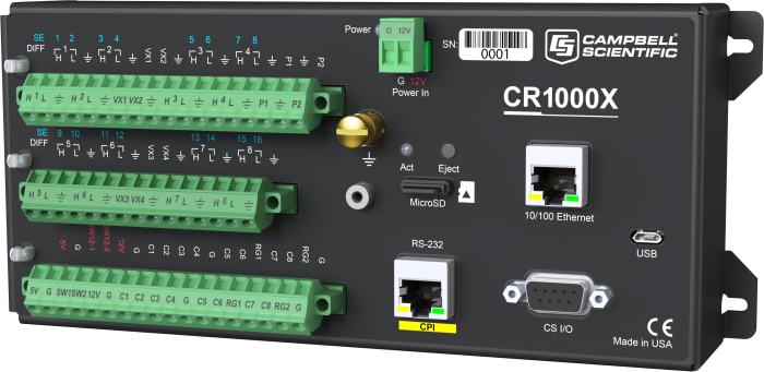 CR1000X是一款低功率的設備,用于傳感器測量、直接/遠程通訊連接、數據分析、外部設備控制、數據和程序的存儲,采用密封裝置屏蔽射頻干擾,金屬不銹鋼外殼。精密時鐘,支持Campbell Scientific 數據采集器通用的類BASIC編程語言—具備數據處理和分析功能。CR1000X 接線面板上有兩個開關12 V 端子, 16 個模擬測量端子,端子可拆卸。