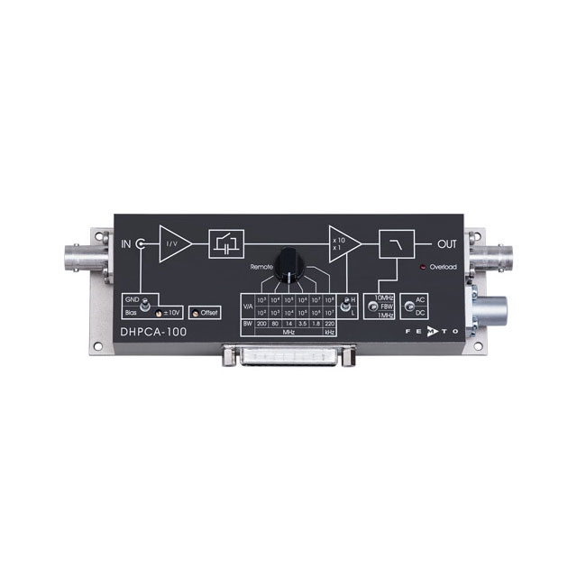 DHPCA-100 的許多特性包括:從 10 2到 10 8 V/A 的可調增益、可調偏置和偏移電壓、可切換的 10 MHz 和 1 MHz 低通濾波器、可切換的 AC/DC 耦合以及所有重要的選項可以直接在設備上或通過數字接口(例如使用 PC)控制功能。所有這些都安裝在堅固、緊湊且符合 EMC 標準的外殼中,允許直接在信號源進行放大,而無需長電纜或干擾信號。