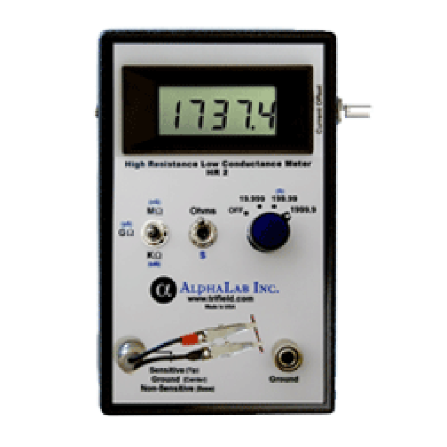 HR2型儀表測量電阻在1歐姆到1.9999 Tera歐姆(1.9999×1012ohms)的9個范圍內,電導在0.00到199.99 pS (pico siemens,或pico mhos)的單一范圍內,所有低電壓< 2伏的樣品。基本精度為讀數+/- 2% +/- 1計數。對于高于1.9999 Tera歐姆的電阻,電導范圍可用于測量低至0.01 pS (100 T歐姆)的電導。儀表有一個電導范圍,因為同時具有高電阻和高電容的樣品在電導下(通常在一秒內)比在電阻上(幾秒)更快地沉降到最終值,電導也能夠檢測比電阻范圍更高的電阻。注意,單位為T歐姆的電阻是單位為pS的電導的倒數,因此電阻可以從電導計算出來。例如,100 pS是0.01 T歐姆(10 G歐姆),而199.99 pS的高可讀電導本質上是5 G歐姆。
