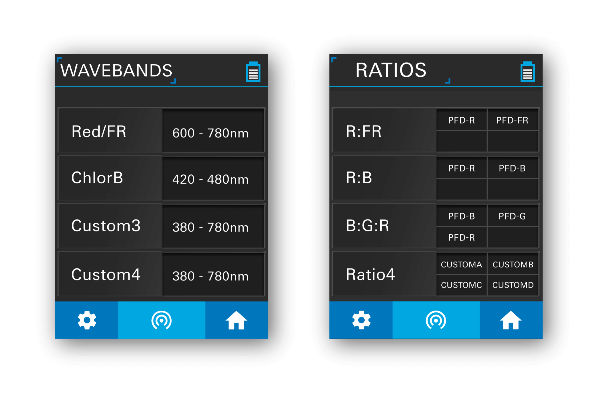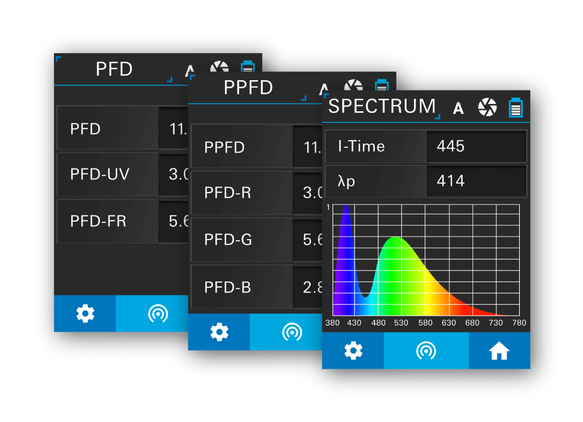 測(cè)量光譜操作、高度調(diào)整和植物定位的實(shí)時(shí)變化。只需單擊一下,LI-180即可記錄數(shù)十個(gè)變量,包括 PAR(特定顏色光合光子通量密度 (PPFD))、光子通量密度 (PFD)、輻照度(W/m2), 和更多。選擇測(cè)量結(jié)果以查看詳細(xì)信息,例如紅與藍(lán)或紅與遠(yuǎn)紅強(qiáng)度的比率。