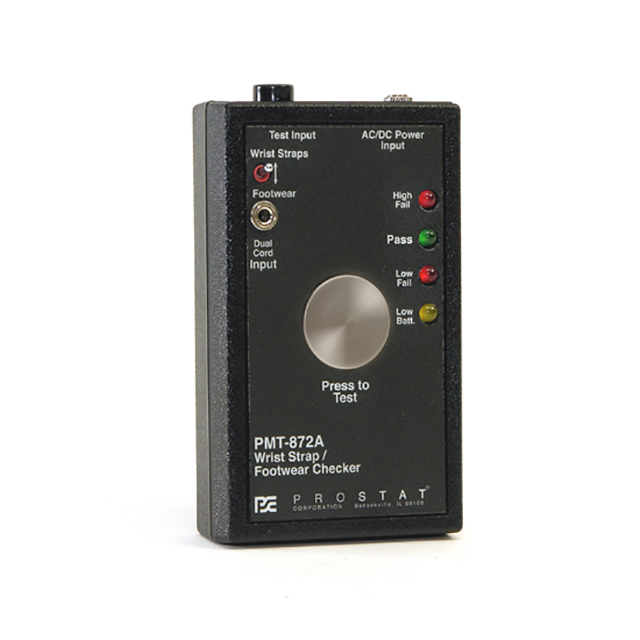 PMT-872 是一款獨特、高度便攜、電池供電的多功能 PASS/FAIL 性能驗證器。它確認了腕帶、腳跟帶和 ESD 控制鞋類的工作阻力范圍。 PMT-872 具有一個大的測試按鈕、帶有綠色 PASS 燈的可聽見的 PASS 嗶嗶聲、紅色低電平和高電平故障燈以及黃色電池電量低指示燈。為可選的 AC-DC 電源適配器和測試雙導制腕帶提供了額外的連接。前面板撥動開關允許在一個工位上測試腕帶和鞋類。鞋類測試板、卡扣連接器和引線可以單獨購買。