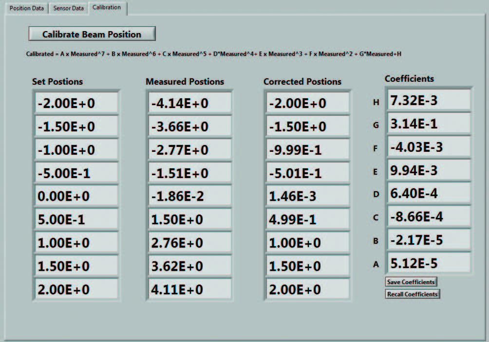 這需要使用微米級線性階段(只有 1 根軸)。如左側的校準界面所示,該程序包括儀表調零,移動 QUAD 探測器至九個分立位置(+2000 mm 至 -2000 mm)并采集 QUAD 讀數。然后,該程序會確定校正系數(最后一欄)并將其運用到原始數據以到達“校正位置”。現在,QUAD 探測器已校準完畢!