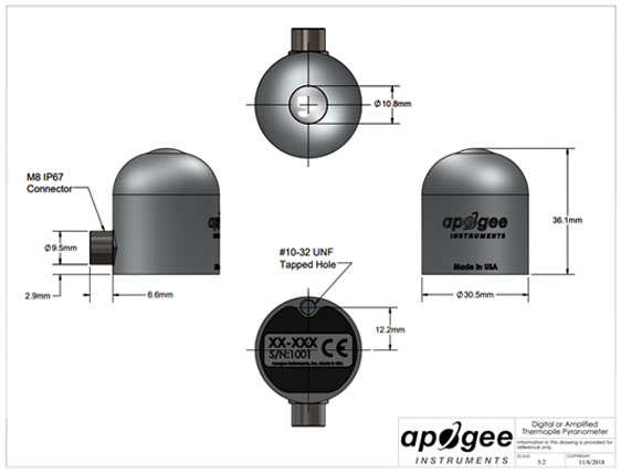 Apogee Instruments SP-522熱射計由熱電堆探測器、丙烯酸擴散器、加熱器和信號組成 處理電路安裝在陽極氧化鋁外殼,和電纜連接傳感器到一個 測量設備。傳感器是盆栽固體,沒有內部空氣空間,并為連續設計 室外環境短波輻射的測量。SP-522模型輸出數字信號使用 基于RS-232或RS-485的Modbus RTU通信協議。