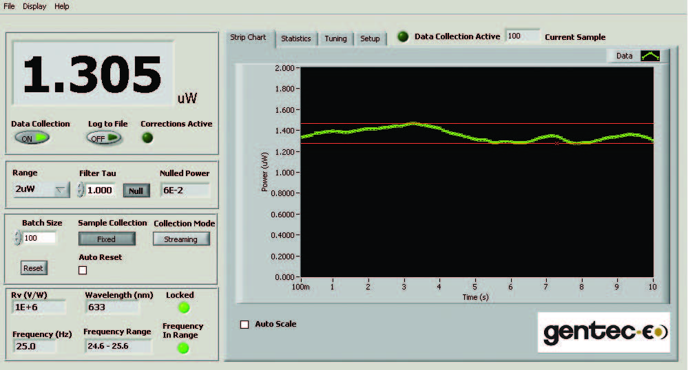 無論選擇哪個顯示屏標簽,儀器控制和輻射功率測量值始終可見,因此可輕松更改輻射計設置。儀器控制包括:量程、Tau 過濾器、批次大小、數據收集模式、重置選項和用于背景消除的空按鈕。此外,還有更多設置和操作狀態指示燈,包括:探測器接收、波長、頻率(實際)、鎖定和量程內頻率等指示燈。帶狀圖可連續或按批次顯示以瓦為單位的輻射功率測量值。請選擇滿刻度、自動刻度或手動定標選項。