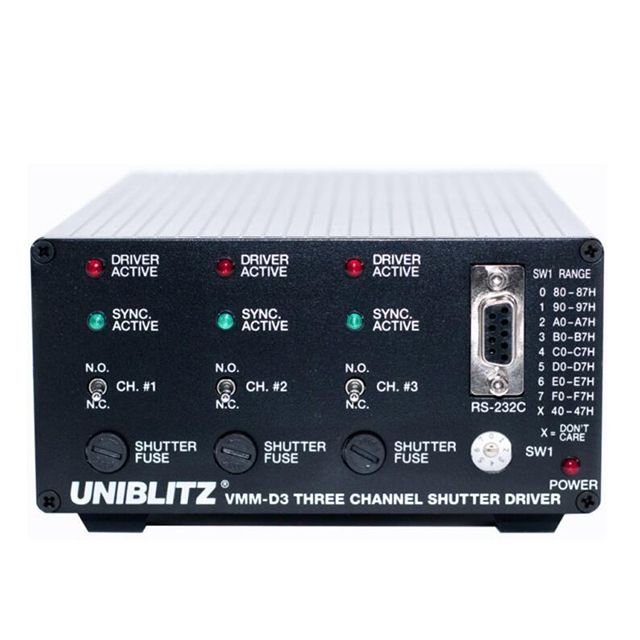 Uniblitz VMM-D3 是一款三通道快門驅動器,能夠獨立控制最多三個快門。這種緊湊的設計將三個完整的獨立快門驅動器放在一個精簡的封裝中。有源高電平邏輯輸入允許完全獨立的快門控制。單個輸入將同時激活所有通道,并且單個輸出可用于監控所有快門同步系統電路何時處于活動狀態。三個有源低電平邏輯輸出監控每個同步系統輸出的狀態。還提供可尋址的 RS232-C 串行輸入,可通過計算機串行端口控制這些輸入,從而允許從單個計算機串行端口控制最多八個 VMM-D3 單元和最多 24 個獨立快門。
