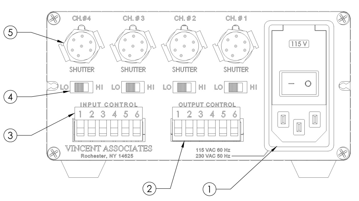 輸入控制 (3) 為每個通道提供高電平有效控制。輸入 TTL 高電平 – 快門打開,輸入 TTL 低電平 – 快門關閉。端子 #5 – 高電平有效,輸入 TTL 高電平 – 所有快門打開,輸入 TTL 低電平 – 所有快門關閉。請參閱 VMM-D3/D4 用戶手冊第 15-19 頁中的端子排布局。