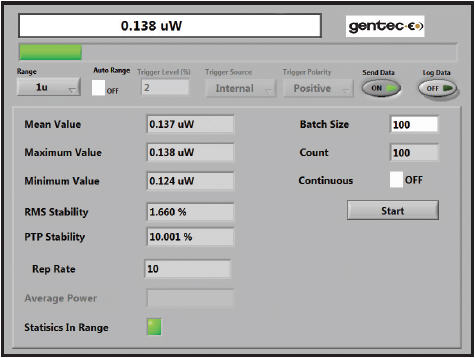 如果您需要測量從皮瓦到毫瓦的較低功率級別,我們推薦 PH 或 PH-B 探測器。在左側所示的軟件屏幕中,我們提供了一個在“統計數據”顯示模式下工作的數據集。我們已在手動重置模式下將批次大小設置為 100 個數據點。您可以看到實時功率(138 毫微瓦)和其他全部統計數據:平均數、大值、小值、均方根和 PTP 穩定性。在左下角處,顯示的波長為 300 納米。您可在此輸入激光器波長并使用波長糾正系數。