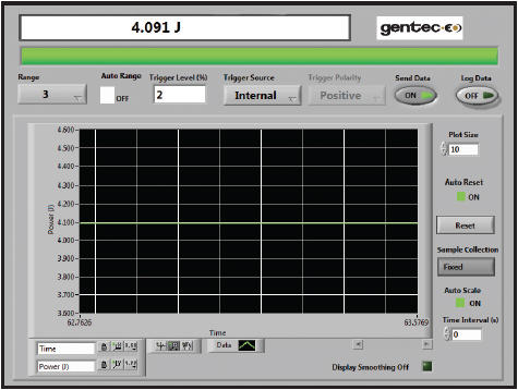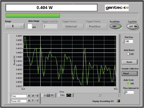 您可以選擇我們提供的任意感溫探測器測量從幾微瓦到 30 千瓦的激光器功率。我們使用我們制造的靈敏度高的一款熱電堆探測器,即 XLP12-3S-H2 型,生成了左圖所示的軟件屏幕。我們選擇的是“示波器”模式,您可以在此監控功率,并同時查看實時功率讀數(0.404 瓦)、條形圖和帶狀圖。通過此屏幕還可訪問量程、觸發器、自動刻度和很多其他監視功能。