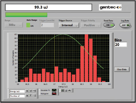 您可以選用我們提供的多款 QE 系列大面積熱釋電探測器,對從 50 nJ 到 250 J 以及從紫外線到遠紅外線的能量進行測量。為演示此功能,我們選用 QE8SP-B-BL 和 M-LINK。通過“直方圖”屏幕,可以繼續查看實時測量值、顯示數據集能量分布的直方圖以及擬合高斯曲線。請注意,您仍然可以訪問量程、觸發器、波長等儀器控制值。