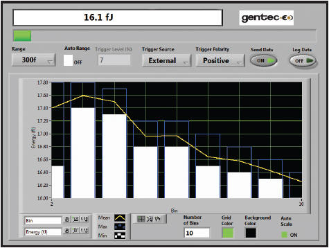 對于從 fJ 到 μJ 量程以及從紫外線到近紅外線的測量,我們建議使用 PE3B-Si 探測器。它使用低端能量探測器技術。另外 M-LINK 還使用了脈沖平均和降噪技術,為您提供各種優勢。在右側示例中,我們在“平均值”模式下工作并捕獲了一個數據集。條形分別代表小(白色)和大(藍色)能量值。帶狀圖根據平均能量值繪制而成。您需要選擇此處給出的“BINS”數。“統計數據”屏幕中提供了“脈沖平均”功能。