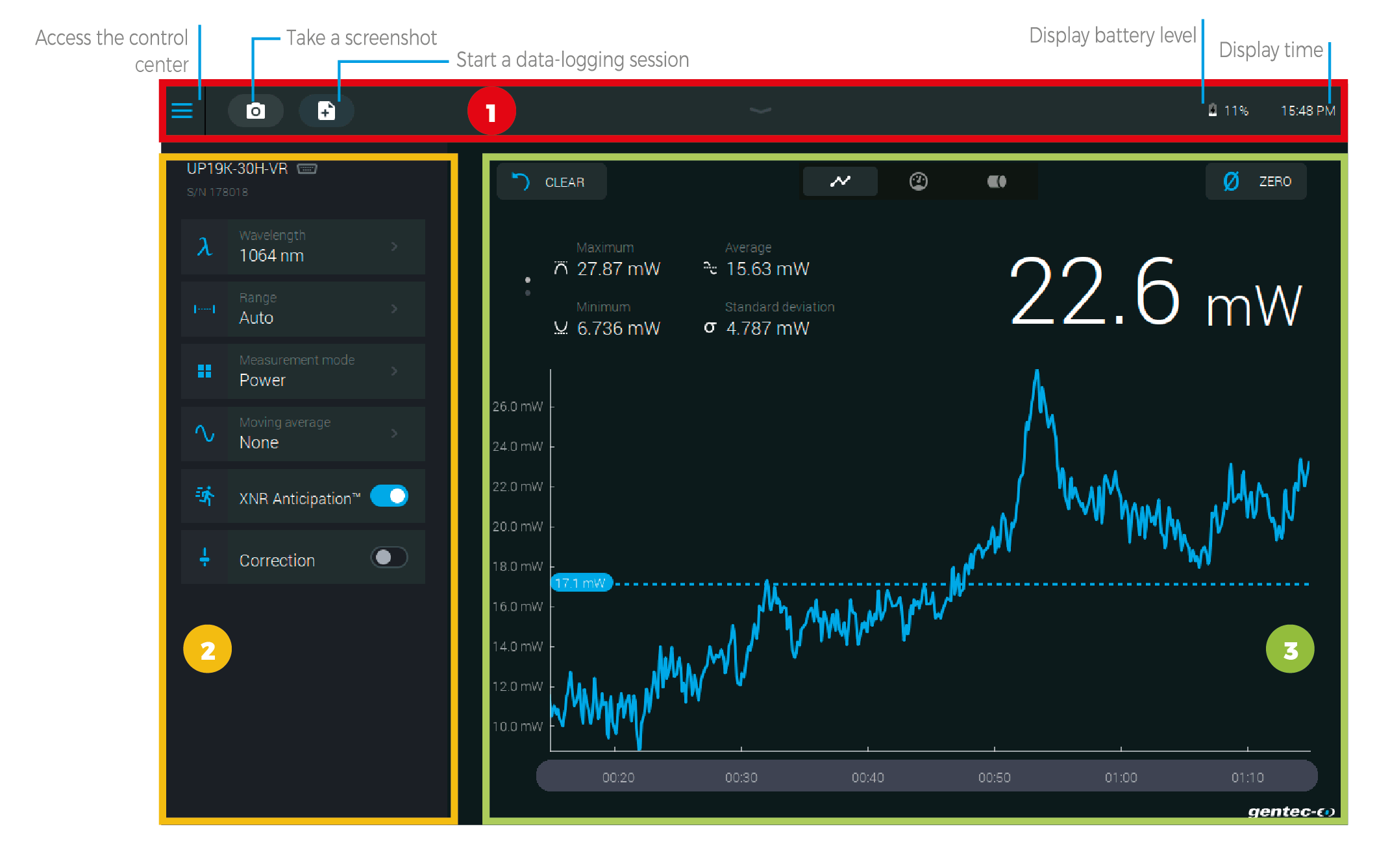 1 - 導航欄 —— 在屏幕頂部,有直接進入控制中心的通道、數據采集按鈕和各種指示值(電池電量和時間)。