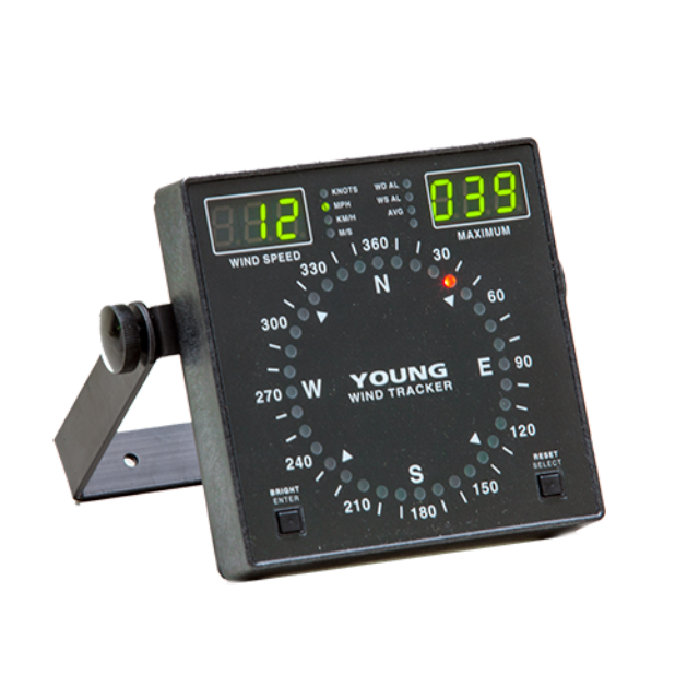 The YOUNG Model 06201 Wind Tracker is a compact wind speed and direction display with advanced features for use in a wide range of applications. Compatible with most YOUNG wind sensors (excluding voltage output models) it will display instantaneous wind speed and maximum wind gust values in your choice of mph, m/s, km/hr, or knots. Wind direction is shown on a circular compass pattern of multicolored LEDs displaying both current direction and variability. Front panel controls allow brightness adjustment and reset of maximum wind speed value. Voltage outputs (0-5 VDC representing 0-100 m/s and 0-360 degrees) are standard. The included dual power supply is compatible with 110 VAC or 230 VAC supply voltages. The Wind Tracker can be enabled to display average values. Alarm relay connections are available for wind speed and direction. Multiple displays can be used with a single sensor. This display is very compact for easy mounting on vertical bulkheads or wall surfaces.