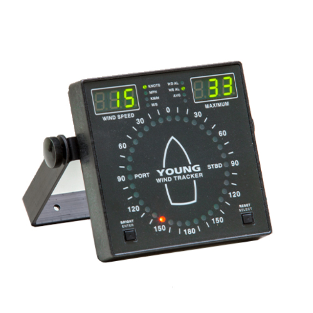 The YOUNG Model 06206 Wind Tracker is a compact wind speed and direction display with advanced features such as relative wind angle and NMEA serial I/O making it suitable for shipboard use. Compatible with most YOUNG wind sensors (excluding voltage output models) it will display instantaneous wind speed and maximum wind gust values in your choice of mph, m/s, km/hr, or knots. Wind direction is clearly displayed on a circular pattern of LEDs. Bold front panel graphics give a quick indication of wind angle relative to vessel heading. Brightness control allows adjustment for best viewing in any light. Luminous front panel markings allow viewing even in a darkened pilothouse. Voltage outputs (0-5 VDC) are a standard feature. The display will operate directly with a 12 or 24 VDC supply (12-30 VDC, 3.5W); a dual power supply (110 VAC / 230 VAC) is included. The Wind Tracker can be enabled to display average values. Alarm relay connections are available for wind speed and direction. The upper right display can also be set to numerically display the relative wind direction with reference to the bow as opposed to maximum wind gust. Multiple displays can be used with a single sensor. The Marine Wind Tracker is very compact for easy mounting on vertical bulkheads or consoles.