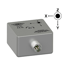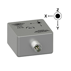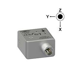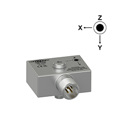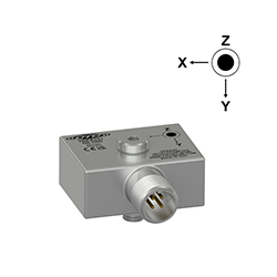 Low Cost Miniature Industrial Triaxial Accelerometer, Side Exit 4 Pin Mini-MIL Connector, Follows Cartesian Phase Coordinate System, 100 mV/g, ±15%