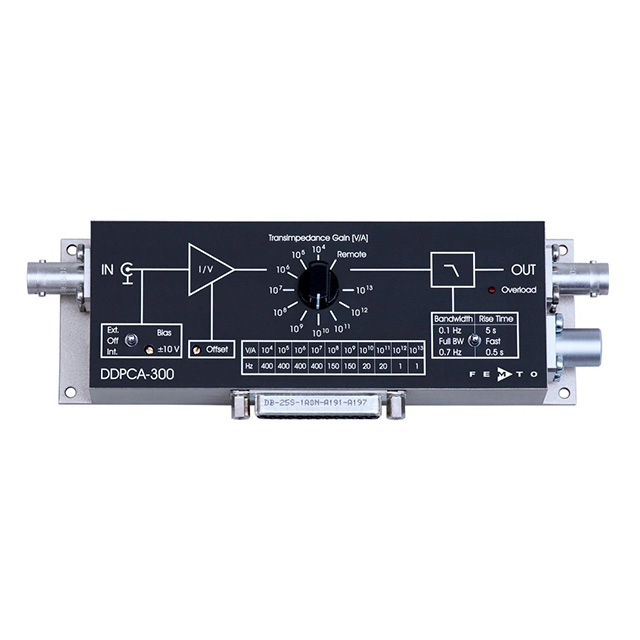 The adjustable apF amplifier DDPCA-300 is the newest member of a variety of low noise transimpedance amplifiers. The extraordinary design achieves excellent input noise figures as low as 0.2 fA/√Hz and 0.4 fA peak-to-peak.