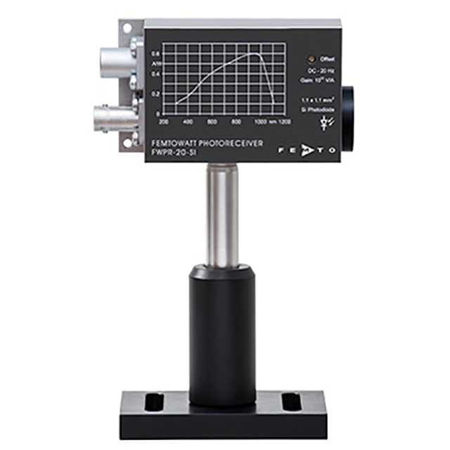 FWPR-20 series optical receivers combine low noise Si or InGaAs PIN photodiodes with specially designed transimpedance amplifiers, with very high gain and very low noise up to 1012 V/A. Because of its very low NEP of 0.7 fW/√ Hz, this unique combination produces an optical receiver with flying shoe sensitivity. Optical power as low as about 50 fW can be directly detected. Combined with the optional FEMTO lock-in amplifier, it can even detect the power level within the range of Yafeiwa.