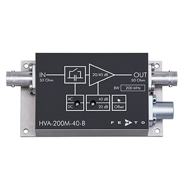 Output impedance 50 Ω. Offset adjustable by trimpot. Output short-circuit protected. Power supply via 3-pin Lemo® socket. A mating connector is provided with the device. Optional power supply PS-15 available. For further information please view the datasheet or contact FEMTO.