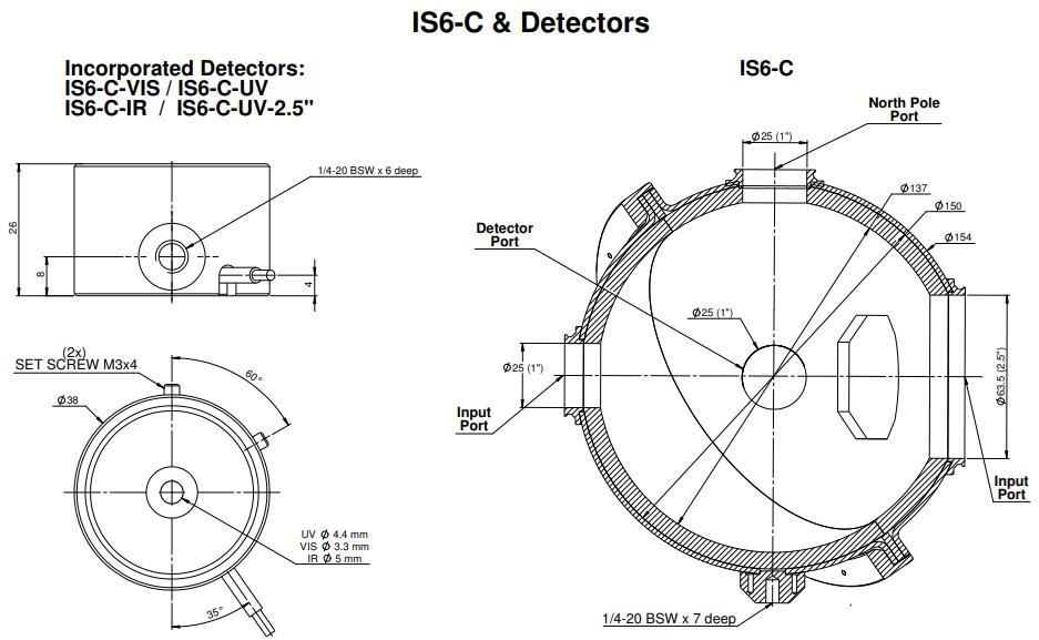 The IS6-C-IR is a 6” integrating spheres (5.3” inside) with a Germanium detector for use with collimated (C) beams. The IS6-C-IR comes with a IR detector, is calibrated from 700 to 1800nm and can measure up to 30W.