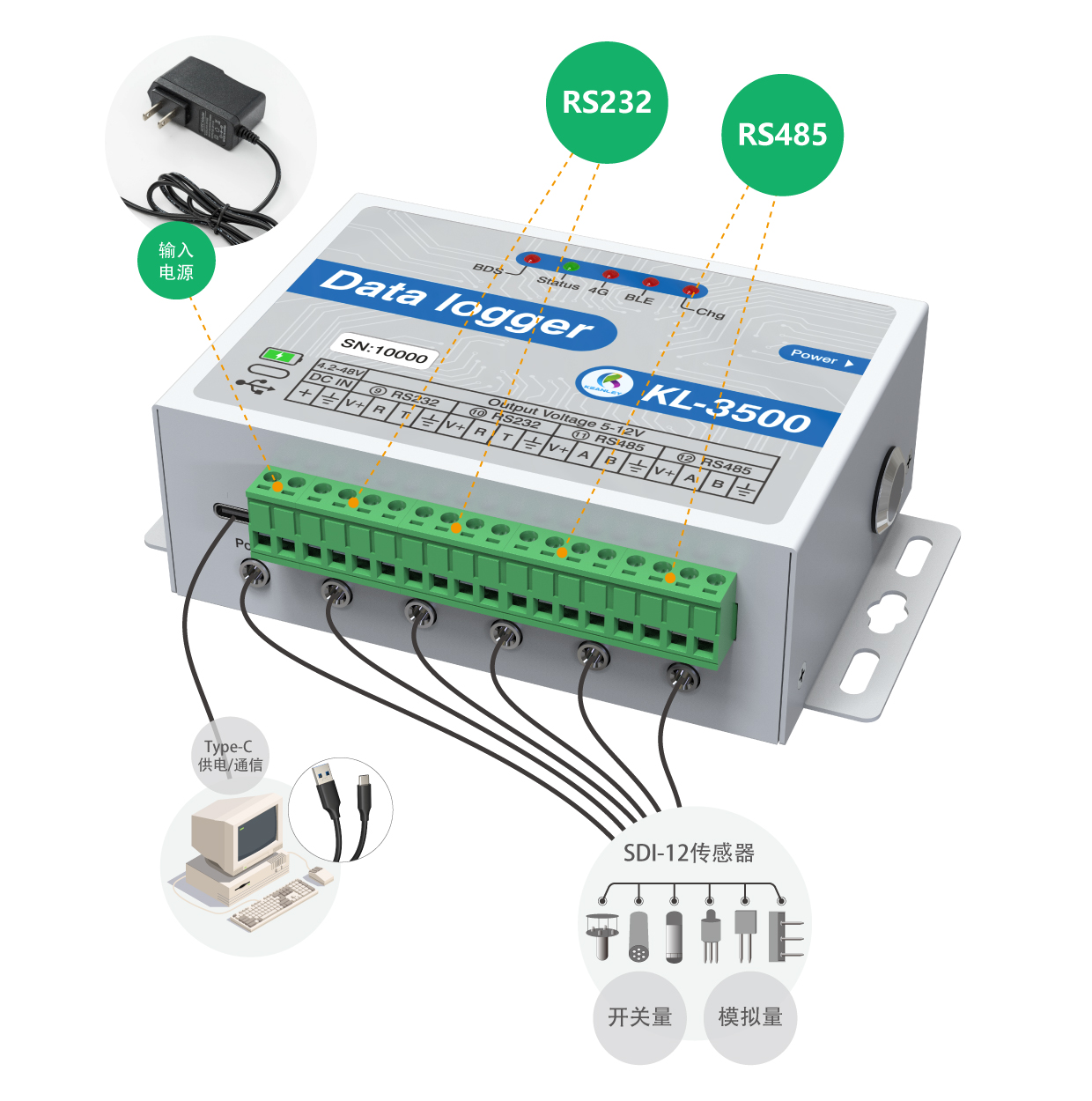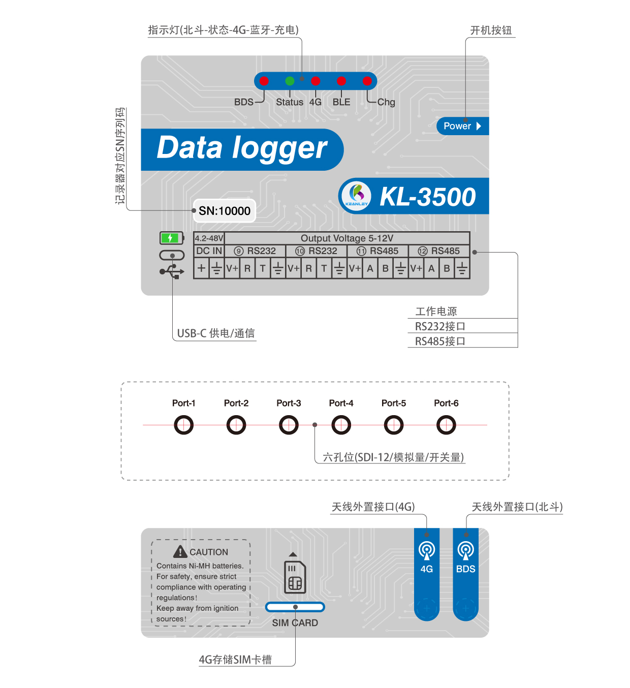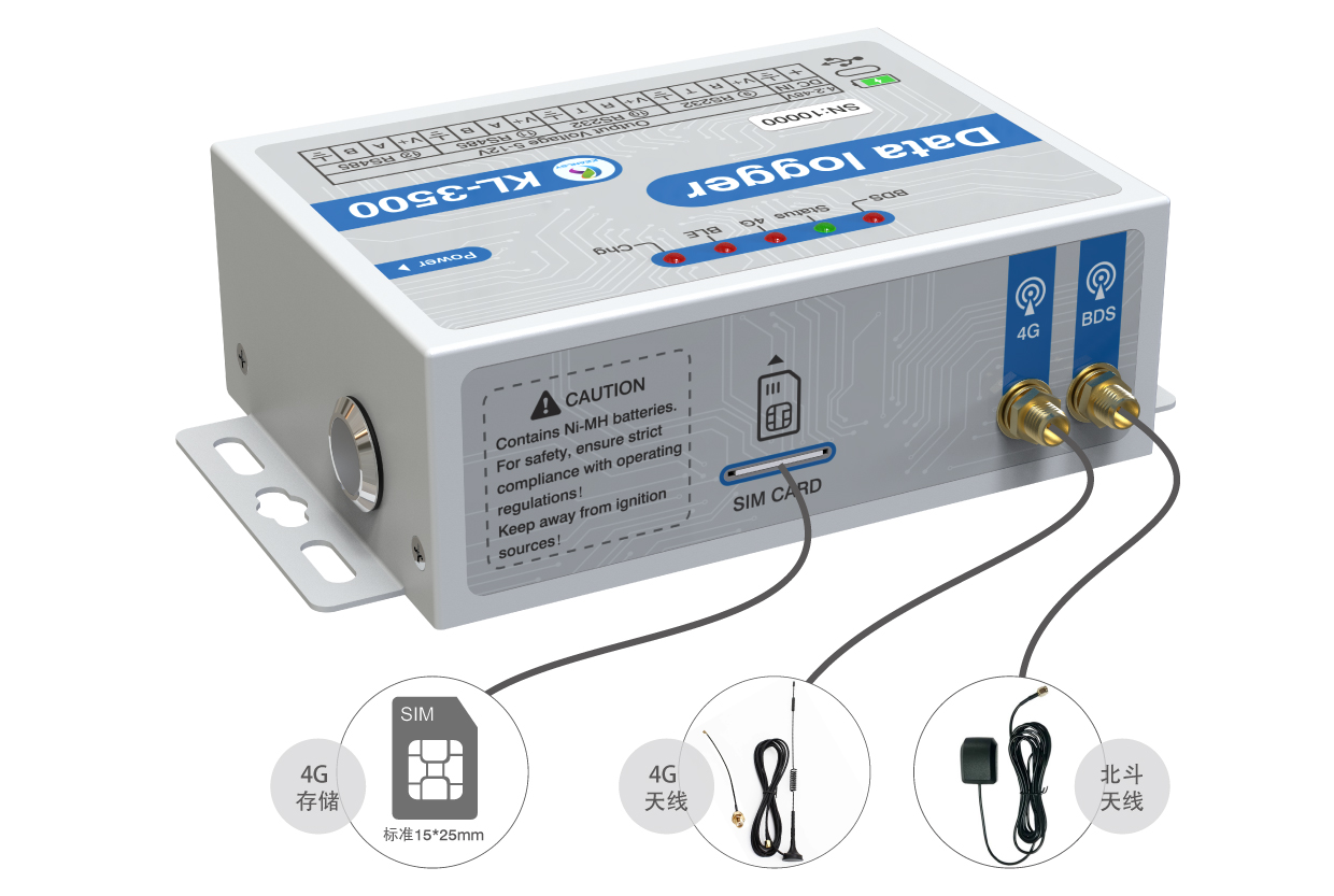The KL-3500 is specifically designed for SDI-12 protocol and DDI mode sensors, as well as RS485, RS232, analog, and pulse sensors. The data logger features 12 connection ports (6 sensor ports, 2 powered 485 ports, 2 powered 232 ports, 1 barometric pressure/temperature port, and 1 Beidou data port). Please refer to the port descriptions in the software interface for details. It includes one 2P 3.81mm terminal block power supply port, one TYPE-C port (for both power and communication), one power button, and five status indicator lights (LED1 for Beidou status, LED2 for 4G status, LED3 for operational status, LED4 for Bluetooth status, LED5 for charging status). There are two antenna connectors (for 4G communication and Beidou). The upper section houses a battery compartment for 6 AA Ni-MH or alkaline batteries.