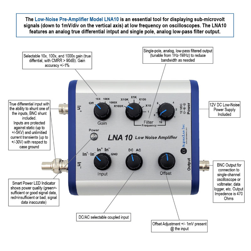 • Description: With this preamp, sub-microvolt signals can be displayed on scopes which typically only go down to 1mV/div on the vertical axis. The preamp includes an analog true differential input and an analog lo
