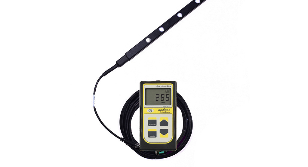 Apogee line quantum sensors measure a spatial average of photosynthetically active radiation (PAR). The MQ-301X has a separated sensor bar with 10 sensors connected to a hand-held meter via cable. The sensor housing design features an integrated bubble level and is fully potted making the sensor weatherproof. Typical applications include photosynthetic photon flux density (PPFD) measurement over plant canopies in outdoor environments, greenhouses, and growth chambers, and reflected or under-canopy (transmitted) PPFD measurements in the same environments.