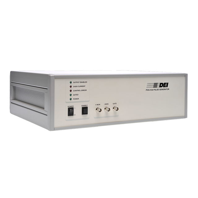 The PVX-4130 pulse generator is a direct coupled, air cooled, solid state half-bridge (totem pole) design, offering equally fast pulse rise and fall times, low power dissipation, and virtually no over-shoot, undershoot, or ringing. It has overcurrent detection and shutdown circuitry to protect the pulse generator from potential damage due to arcs and shorts in the load or interconnect cable.