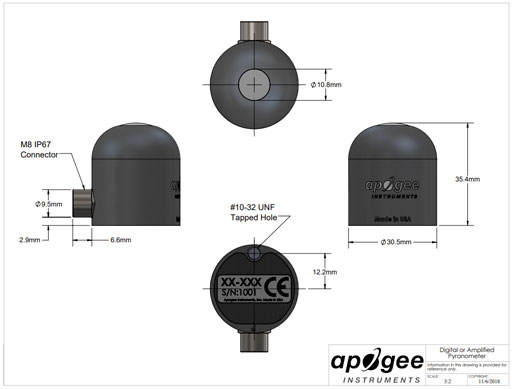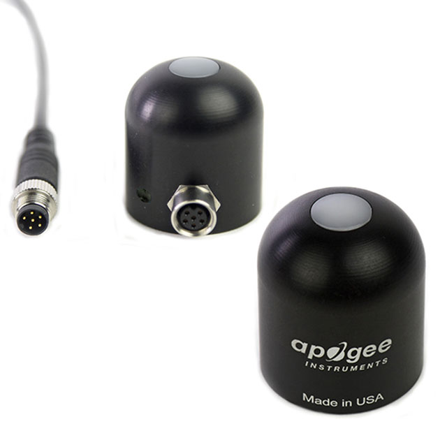 Apogee Instruments SP series pyranometers consist of a cast acrylic diffuser (filter), photodiode, and signal processing circuitry mounted in an anodized aluminum housing, and a cable to connect the sensor to a measurement device. Sensors are potted solid with no internal air space and are designed for continuous total shortwave radiation measurement on a planar surface in outdoor environments. SP series sensors output an analog voltage that is directly proportional to total shortwave radiation from the sun. The voltage signal from the sensor is directly proportional to radiation incident on a planar surface (does not have to be horizontal), where the radiation emanates from all angles of a hemisphere.