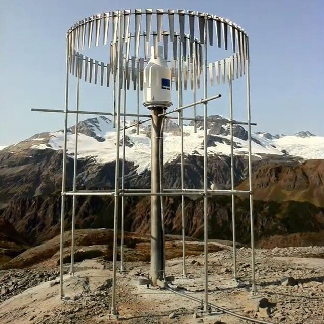 Precipitation is measured using a vibration line load sensor. Instruments and windshields are mounted on the base. With antifreeze, any solid sediment will melt in the container. As a result, no electric heating is required, thus eliminating a common source of error. Add a thin layer of oil to prevent any evaporation.