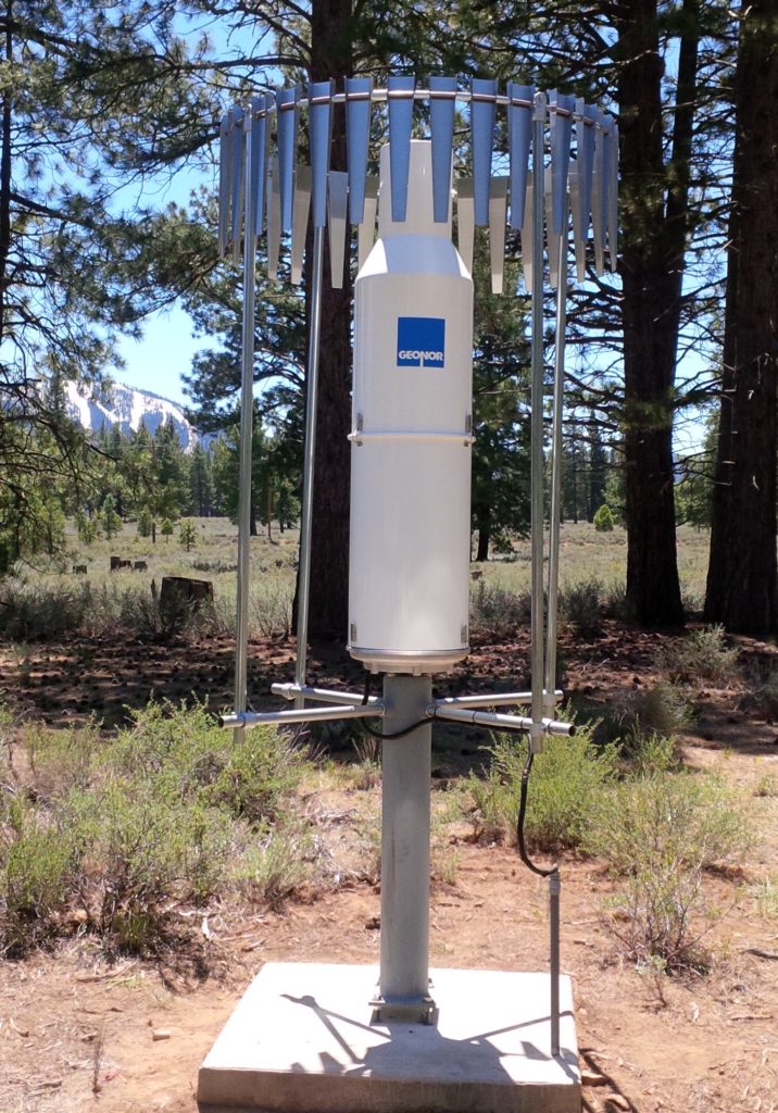 The original T-200B had a capacity of 600 mm (24 in) and was fitted with a vibrating string sensor. Geonor now offers 1000 mm (40 in), 1500 mm (60 in) and 3000 mm (120 in) precipitation -- rain gauges, and can be combined with three sensors. The manometer has a protective housing with WMO standard 200 cm2 inlet.