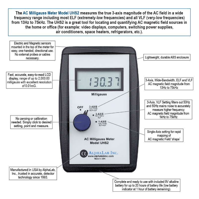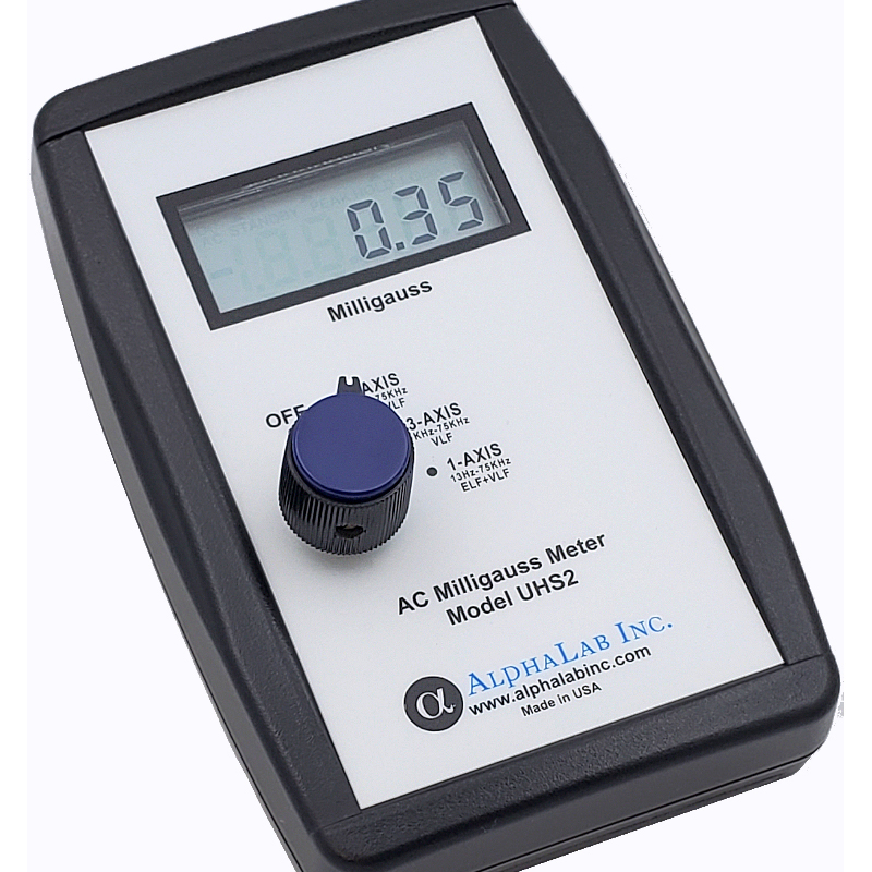 The AC Milligauss Meter Model UHS2 measures AC magnetic field in a wide frequency range of 13 Hz to 75 kHz (75,000 Hz). The frequencies include most ELF (that is, frequencies below 1 kHz) and VLF (above 1 kHz) magnetic fields. The meter measures the true 3-axis magnitude of the AC field. Two other more specialized measurements can also be performed: 3-axis VLF-only (1kHz – 75 kHz) to measure the strength of higher-frequency fields, and 1-axis full bandwidth (13 Hz – 75 kHz) to determine the principal direction of the AC magnetic field.