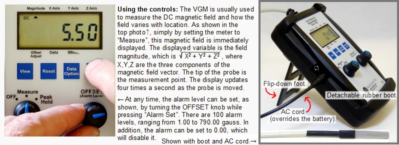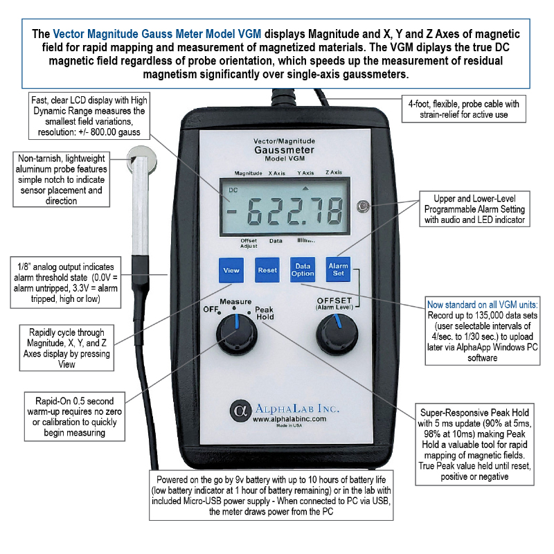 The model VGM is designed for rapid identification and measurement of areas that are magnetized. It is a DC gaussmeter with X,Y and Z sensors at the end of a probe. It displays the magnitude of the field and the X, Y, and Z components, showing both the actual values and the peak values of all the variables. In addition, whenever the field magnitude exceeds a value that you set, an alarm sounds and lights up, and a “logic high” signal appears at the output jack. The meter is shipped ready-to-use, and includes a 9-volt battery, USB power adapter, and calibration certificate. This meter is optimized to measure magnetized parts; its range of 799.99 gauss is not high enough to measure the surface of most permanent magnets.
