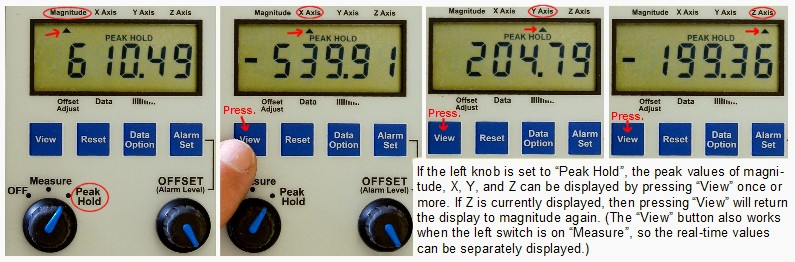 Useful for long-term peak detection. All four peak values remain stored (and continue to update if a higher peak is encountered) until you reset them. The peak values and the present values of magnitude, X, Y, and Z can be displayed at any time.