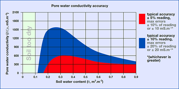 The WET Sensor is able to calculate pore water conductivity (ECp) which is the EC of the water available to plant roots. The ECp calculation is derived from an approximate relationship between dielectric properties. This applies particularly well to WET Sensor readings, which are taken at the same frequency within the same defined region of soil/substrate. The approximation is valid in most soils and is particularly accurate in mineral wool and other artificial substrates media.
