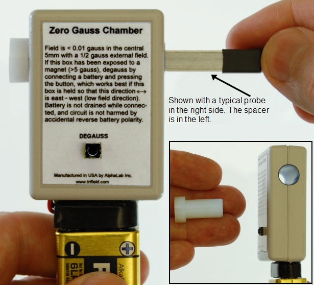 The white plastic part (spacer) can be removed at any time, but it should be used if you want to center a gaussmeter probe inside the chamber. When placed in either end, this white spacer will allow the end of a probe to be inserted exactly 1.6 mm past the center of the chamber. Therefore the actual sensor for AlphaLab models VGM, GM-2, GM-3, 1-ST and 1-HS will be properly centered in the chamber. The zero gauss region has diameter 9.4 mm (0.370”) and occupies the center 5 mm (0.197”) within the chamber. (The chamber dimension in its long axis is 36 mm, or 1.42”). In the center 5 mm, the magnetic field is < 0.01 gauss after pressing the black degauss button, regardless of the orientation of the chamber. It will remain < 0.01 gauss as long as the chamber is not rotated more than 30 degrees from its orientation when degaussed. (Note that this specification is valid if the field outside is < 0.6 gauss, which is characteristic of the Earth field.) Insert the gaussmeter probe as shown below and zero the gaussmeter.