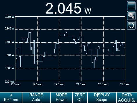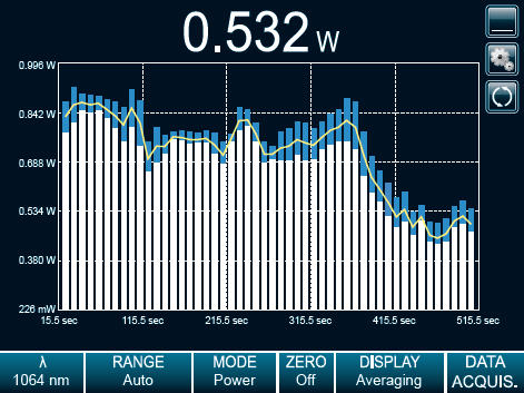 This very unique mode is perfect to show the trend of a laser over time. Set the number of points per batch and let the MAESTRO identify the minimum and maximum values of every batch. A yellow curve then follows the average of each batch, displayed as bars on the screen. The wider the difference between the white and blue portions of a bar (corresponding to the min and max values), the more unstable your laser is.